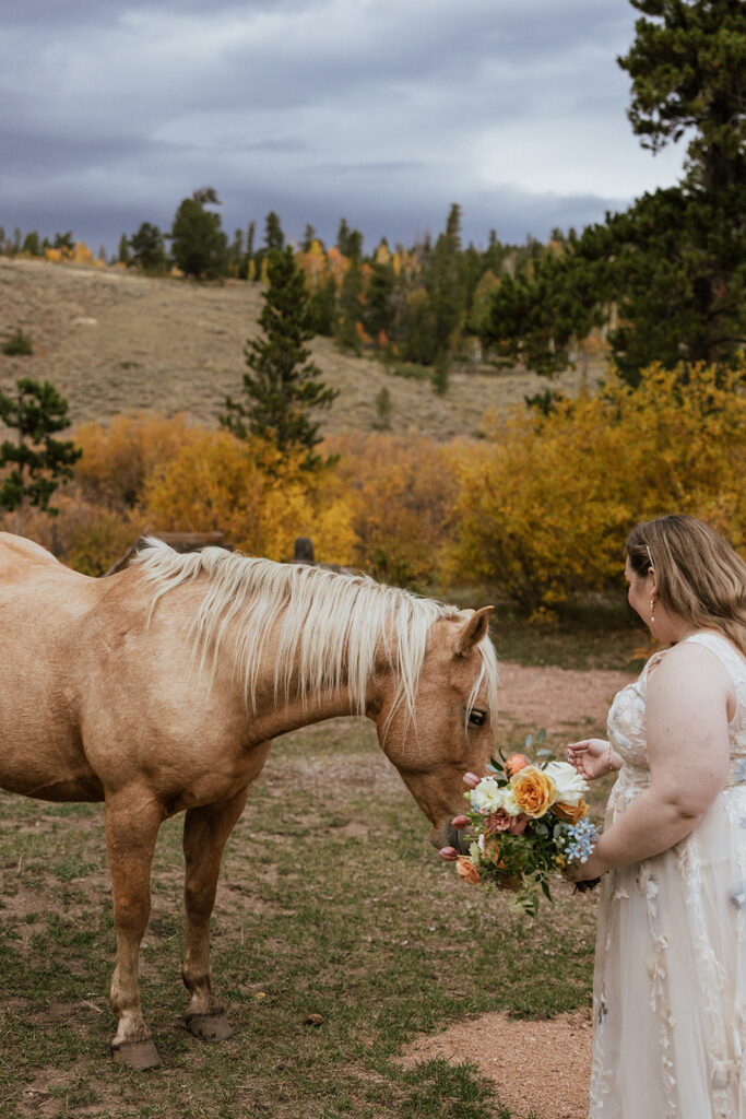 Beaver Meadows Resort Ranch has open meadows, horses grazing in the distance, and mountains that are very clearly there. The skies were gray and heavy most of the day, but that also meant no harsh sun. Their ceremony took place in open land with friends and family gathered close.